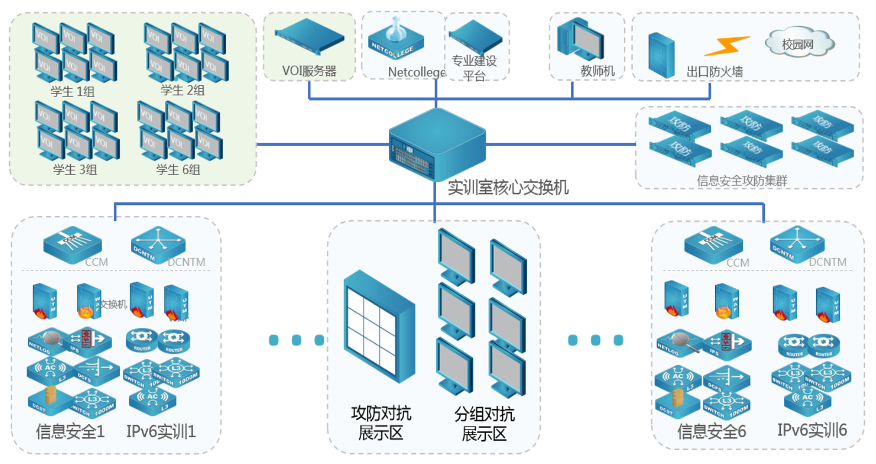 IPv6及信息安全实训室的目标是培养全方位的网络信息安全人才,因此,实训室环境应该能够模拟企业网、园区网的各个安全环节,保证学生学习到的信息安全知识是全面的,毕业后拥有广阔的就业面。