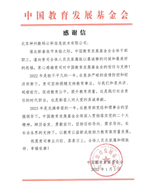 近期,evo视讯真人官网PA真人国际收到中国教育开展基金会的感谢信,以感谢evo视讯真人官网PA真人国际2022年在职业教育领域的贡献和实践,尤其是在全国职业院校大赛(中高职组)中对大赛顺利召开所付出的努力。
