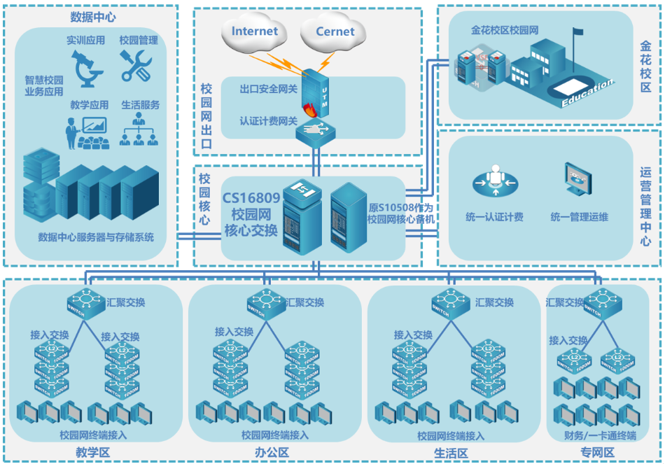 高性能:行业领先芯片资源虚拟化技术,满足校园网各种突发流量转发需求,实现网络自适应,高性能、大表项,能够支撑更多校园网终端在线,完美适用学校的扁平化大二层组网;